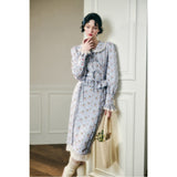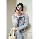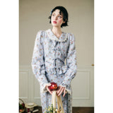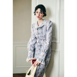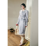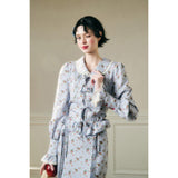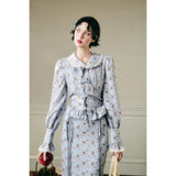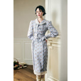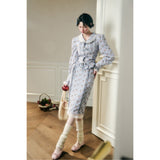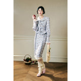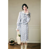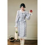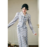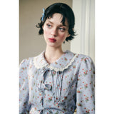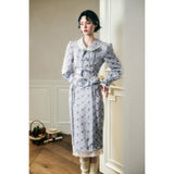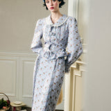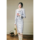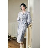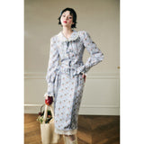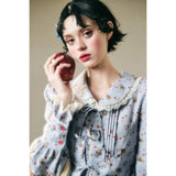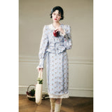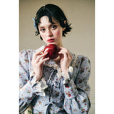 晴れ渡る空のようなパステルブルーと、西洋の画家が描いたような甘やかな苺を組み合わせたブラウスとスカート。ブラウスは繊細なレースの襟とフリルが施されたデザイン。胸元のピンタックとリボンディテールがヴィンテージライクな印象を与え、パフスリーブがフェミニンさを引き立てています。スカートは、タイトシルエットで、レース刺繍が裾からのぞくクラシックなデザイン。縦に入ったピンタックのディテールが、上品なアクセントを加えています。