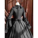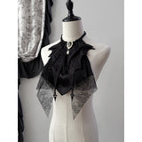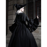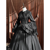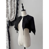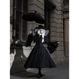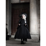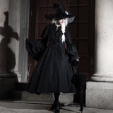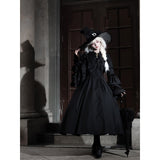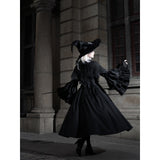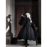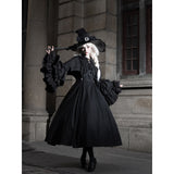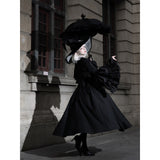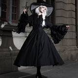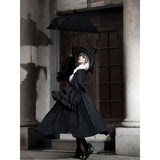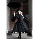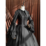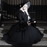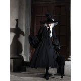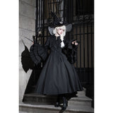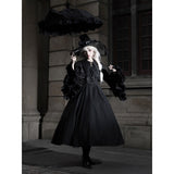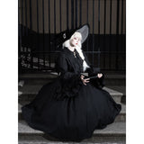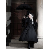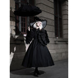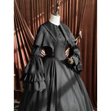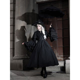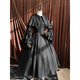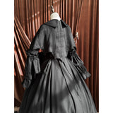 閉ざされた世界で魔法を操る箱庭の魔導者みたいに演出してくれるワンピースとケープ。ボリュームのあるスカートが美しいシルエットを描きます。袖はフリルが幾重にも重なり、繊細なレース装飾が施されており、女性らしさを引き立てます。ケープには蜘蛛の巣を織り込んだ蝙蝠の翼を想起させるミステリアスなデザイン。ゴシックテイストを感じさせるクラシカルでエレガントなアイテム。