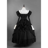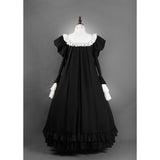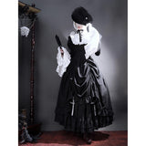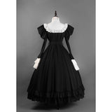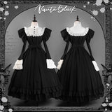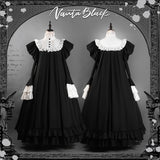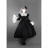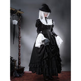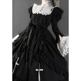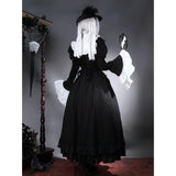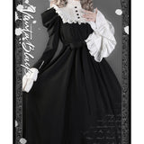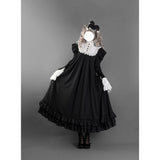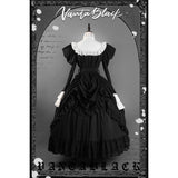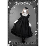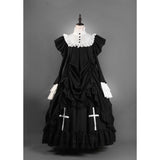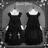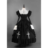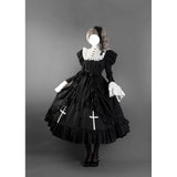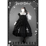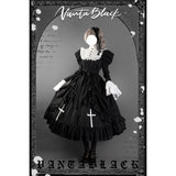 ドールのような美しさを纏ったお嬢様に。深いブラックを基調としたダークで荘厳なゴシックワンピース。ボリューム感のあるスカートと膨らみのある袖部分が特徴的。レイヤードされた内側のスカートには十字架が刺繍されています。
