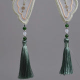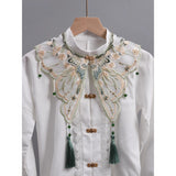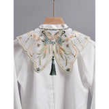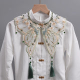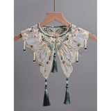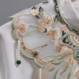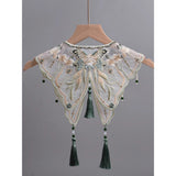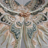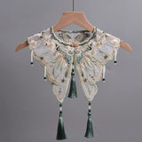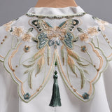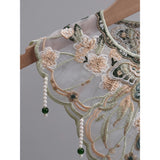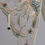 透明感のあるオーガンジー生地に、淡いグリーンとゴールドの糸で立体的に刺繍された蝶と草花が舞うように広がり、まるで羽を広げた幻想的な蝶そのもの。裾にあしらわれたパールや緑玉、房飾りが揺れるたびに雅な気配を漂わせ、東洋的な神秘とロマンティックな美しさを融合させています。まるで物語の中から抜け出したようなファンタジックな雰囲気を演出します。