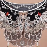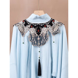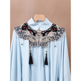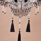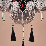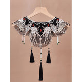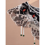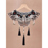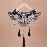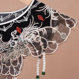 黒地に白銀の刺繍が際立つ、夜空に舞う羽根を思わせる付け襟。透け感のあるチュール地に浮かぶ花模様と繊細なラインは、まるで月光に照らされた幻想的な庭園。深緑と白のビーズに揺れる黒い房飾りが、静かな余韻を残しながら気品を添えています。