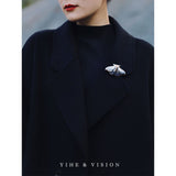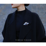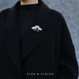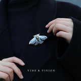 月明かりの夜に優雅に舞う蛾をモチーフにした陶器のブローチ。翅を少し開いた状態で、特製の黒地に青と白の釉薬を施し、全体的に冬の蛾のような雰囲気に仕上がっています。触角や胴体、翅には金色のアクセントを添え、繊細なデザインに仕上げました。