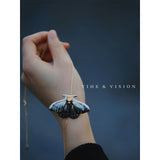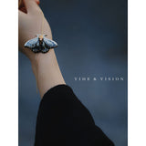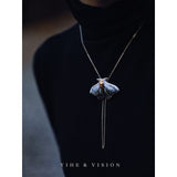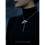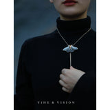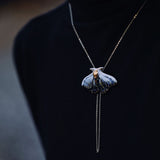 月明かりの夜に優雅に舞う蛾をモチーフにした陶器のネックレス。翅を少し開いた状態で、特製の黒地に青と白の釉薬を施し、全体的に冬の蛾のような雰囲気に仕上がっています。触角や胴体、翅には金色のアクセントを添え、繊細なデザインに仕上げました。