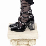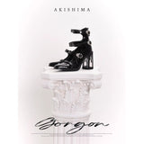 ギリシャ神話に登場する狂暴の女神“ゴルゴーン”をテーマにしたクロコダイル柄のヒールパンプス。艶やかなパテントレザーで仕上げたアイテムで、透明なクリアヒールには黒い滴のようなデザインが施されています。シルバーのバックルと、十字架のチャームがゴシック調の雰囲気を強調しています。