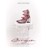 ギリシャ神話に登場する狂暴の女神“ゴルゴーン”をテーマにしたクロコダイル柄のヒールパンプス。艶やかなパテントレザーで仕上げたアイテムで、透明なクリアヒールが存在感たっぷり。シルバーのバックルと、十字架のチャームがゴシック調の雰囲気を強調しています。