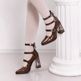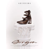 ギリシャ神話に登場する狂暴の女神“ゴルゴーン”をテーマにしたクロコダイル柄のヒールパンプス。艶やかなパテントレザーで仕上げたアイテムで、透明なクリアヒールには茶色い滴のようなデザインが施されています。シルバーのバックルと、十字架のチャームがゴシック調の雰囲気を強調しています。