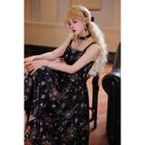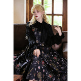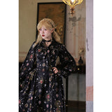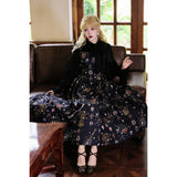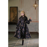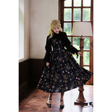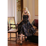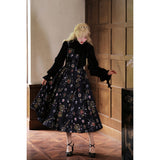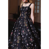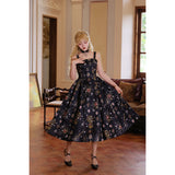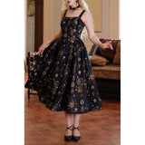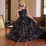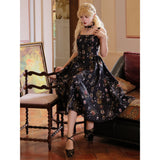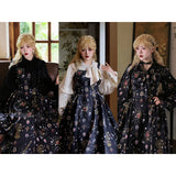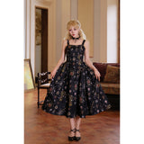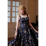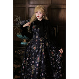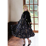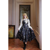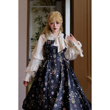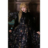 天球儀や、煌びやかな宝飾品、輝く星々など、神秘的でゴシックなモチーフが描かれたジャンパースカート。ウエストラインが強調された美しいシルエットとなっています。クラシックなエレガンスとゴシック調の要素が融合したアイテム。