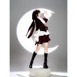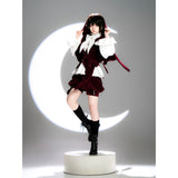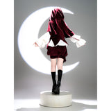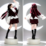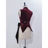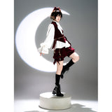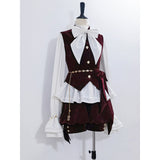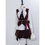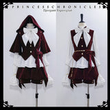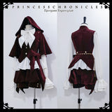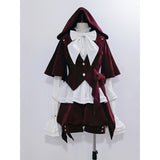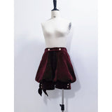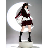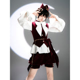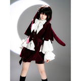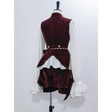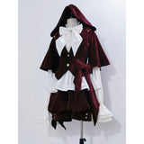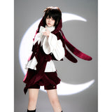 ウサ耳のフードが付いたショート丈のジャケットと、ウエストでシェイプされたシルエットのベストと、ふわりと膨らんだハーフパンツ。ベルベット調のボルドーカラーと金色のボタンが貴族的な雰囲気を高めており、ファンタジックでロマンティックな印象に仕上げられています。ゆるっとカジュアルに着こなしてみて。