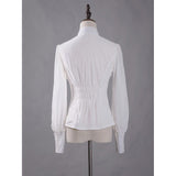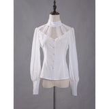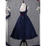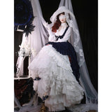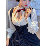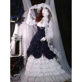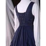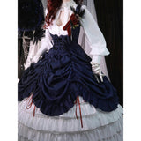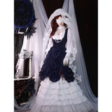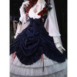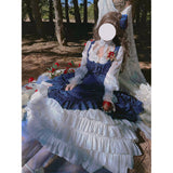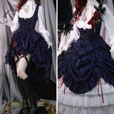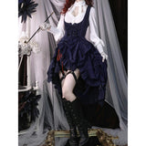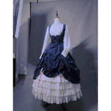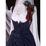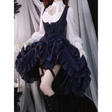 ウエスト部分にコルセットを装飾したような紺青色のジャンパースカートと、ハイネックなブラウスとペチコート。まるで森に住む白雪姫みたいな雰囲気に。ボリュームのある膨らみが優雅な印象を与えてくれるアイテム。