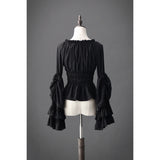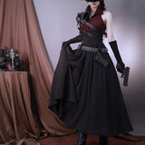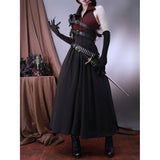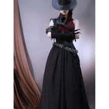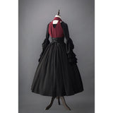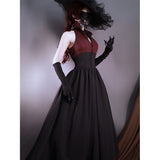 ミステリアスでエレガントなお嬢様を演出してくれる編み上げジャンパースカートとブラウス。ジャンパースカートの上半身はボルドーのハイネックホルターデザインで、ファスナーがフロントに施され、モダンな要素をプラスしています。後ろは美しいカットアウトがあり、レースアップ仕様でシルエットを調整可能となっています。ブラウスは、シャーリングデザインがウエストを引き締め、メリハリのあるシルエットを演出しています。ボリュームたっぷりのフレアスリーブは、クラシカルで華やかな雰囲気をプラスしてくれる。クラシカルなヴィンテージドレスのような雰囲気を持ちながらも、洗練されたディテールが現代的。エレガントで気品のあるスタイルに仕上がっています。圧倒的な存在感を放ってみて。