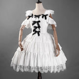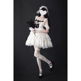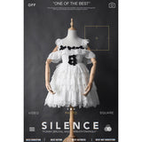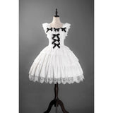 白と黒の詩情が奏でるロマンティックなジャンパースカート。ふんだんにあしらわれたレースとフリルが純真な印象を与えつつ、胸元からウエストにかけて並ぶ黒リボンが甘さを引き締め、コントラストの効いたアクセントになっています。