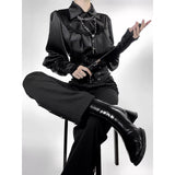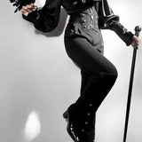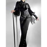 古典的な気配とゴシックな緊張感を同時に纏わせる、威厳と妖しさを内包したロングパンツ。漆黒の生地が脚線に沿って静かに落ち、腰元にはコルセットのような切り替えと装飾的なボタンが施されています。裾に向かってわずかに絞られたシルエットが美しい。洗練された美学と駆け抜ける永遠。計算されたスタイルで更なる高みを目指して。