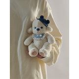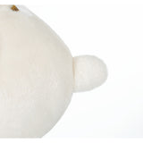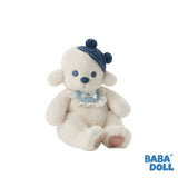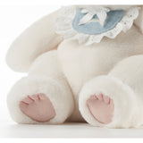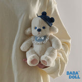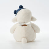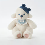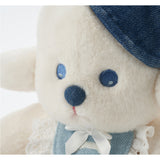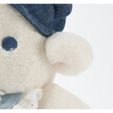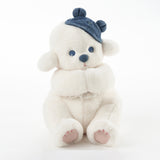抱きしめたくなるような可愛らしい犬の赤ちゃんのぬいぐるみ。その愛らしさに、気づけば時が経つのを忘れてしまいそうになる。もっちりとしたやわらかな毛並み。首元にはリボンとスタイをつけて、頭にはデニムの帽子を被っています。
