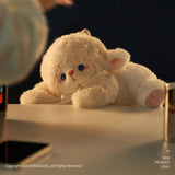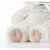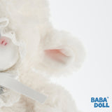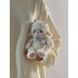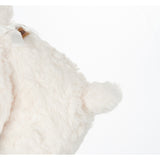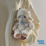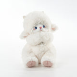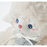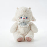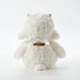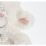 抱きしめたくなるような可愛らしい羊の赤ちゃんのぬいぐるみ。その愛らしさに、気づけば時が経つのを忘れてしまいそうになる。ふわふわした柔らかい毛並み。首元にはリボンとスタイをつけて、頭にはナイトキャップを被っています。もうすぐねんねの時間かな。
