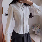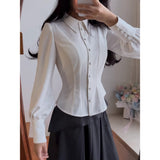 姿勢や佇まいだけで美しさを語るクラシカルブラウス。身体に沿って引かれた立体的なラインは、まるで無駄を削ぎ落とした彫刻のように輪郭を際立たせ、きちんと並ぶボタンや端正な襟元は、規律ある時間や整然とした空間の空気を思わせます。袖にわずかに宿る柔らかな膨らみや、滑らかな生地の流れは、その中に静かに残された余白や呼吸のようで、硬質な美しさの中にほのかなやさしさを感じさせます。