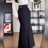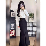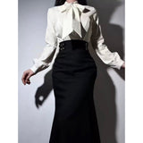 表面的な華やかさではなく、内側に広がる静かな美しさを強調しているマーメイドスカート。ウエストから太ももにかけてはすっと引き締まり、動きを抑えた直線的なラインが、張り詰めた静けさを思わせます。そこから裾に向かってやわらかく広がるシルエットが、しなやかな動きを生み出しています。