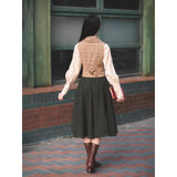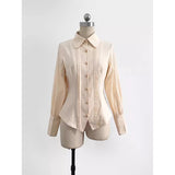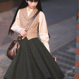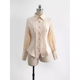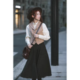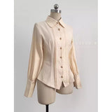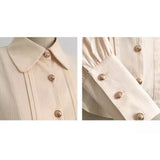 まるで19世紀の文学の中から抜け出したような、知性とロマンを纏うクラシックブラウス。古き良きヨーロッパの午後を思わせるクラシカルな一枚。控えめな生成り色に繊細なストライプが走り、柔らかく光を受けるたびに気品が漂います。丸みを帯びた襟と、カフスに向かってふんわりと広がる袖が、淑女の優雅さをさりげなく演出。金ボタンの装飾が時代の香りを添え、ヴィンテージベストやツイードスカートとの相性も抜群。