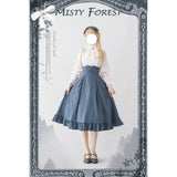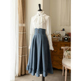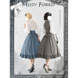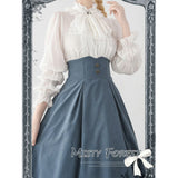 エレガントな英国のお嬢様みたいな雰囲気のハイウエストなクラシカルスカートとベストとキャバリアブラウス。スカートはバックに編み上げが装飾されており、ふわりと広がるシルエットは、優雅な気品溢れる印象を与えてくれる。ハイネックなブラウスは胸飾りが装飾されており、高貴な雰囲気が漂います。時代を超えて輝く永遠のスタイル。