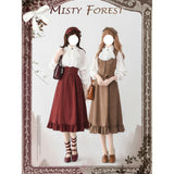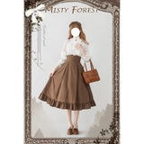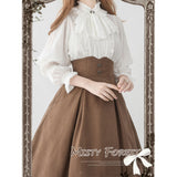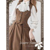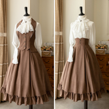 エレガントな英国のお嬢様みたいな雰囲気のハイウエストなクラシカルスカートとベストとキャバリアブラウス。スカートはバックに編み上げが装飾されており、ふわりと広がるシルエットは、優雅な気品溢れる印象を与えてくれる。ハイネックなブラウスは胸飾りが装飾されており、高貴な雰囲気が漂います。時代を超えて輝く永遠のスタイル。