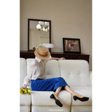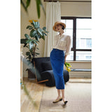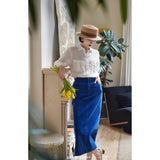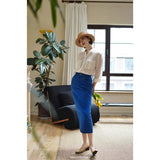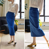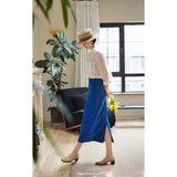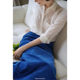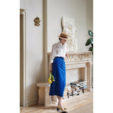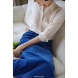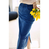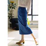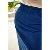 脚を長く、すっきりとした印象に魅せてくれるロング丈のペンシルスカート。十分な硬さと、程よい厚みのコーデュロイの生地となっています。宝石の瑠璃のような、青々とした海のような、鮮やかな青色に目を奪われる。