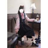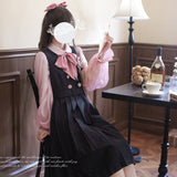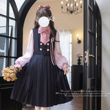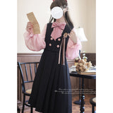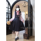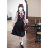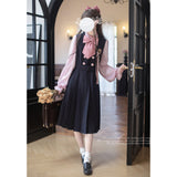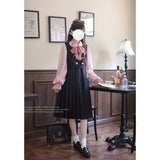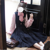 格調高き文学少女みたいに演出してくれるジャンパースカートとブラウス。ジャンパースカートはウエスト位置が高く、ブラウスと同じピンクのボタンが付いています。ダークネイビーとピンクのコントラストに魅了される。知的な上品さを宿したエレガントなアイテム。