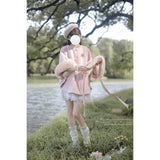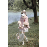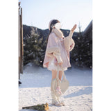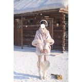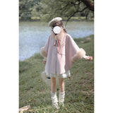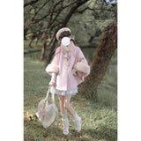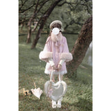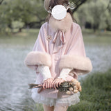 雪の国の妖精が纏うような、淡い夢色のケープコート。やわらかなピンクに包まれたシルエットは、首元と袖を飾るファーがふんわりと温もりを添えています。首元のリボンタイと繊細なブローチが、少女らしい純潔と優雅さを引き立て、まるで白い息とともに甘い魔法が舞い降りるよう。凍てつく空気の中でも心まであたためてくれる、ロマンティックなコート。