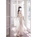月明かりに溶け込むような柔らかさを纏ったリボンブラウスとマーメイドスカート。ブラウスは繊細なフリルを重ね、肩を優しく覗かせるカッティングがロマンティックな余韻を残します。存在感のあるリボンタイが胸元を飾り、気品の中に可憐さを添えるデザイン。スカートはレースの織りなす柔らかな陰影が美しく、裾に向かってふんわりと広がるマーメイドラインが気品を漂わせます。まるで陽だまりの中に咲く白い花のように、儚くも清楚な美しさを湛えた一着。