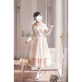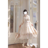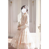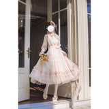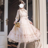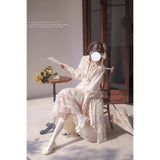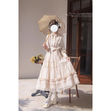 陽だまりの午後を思わせるアンティークロマンティックなジャンパースカートとフリルリボンブラウス。ジャンパースカートはアイボリー地に繊細なフリルとレースを幾重にも重ね、柔らかな光を纏うようなテクスチャーが特徴的。リボンベルトがウエストを優しく結び、クラシカルなシルエットを描きます。ブラウスは高めのフリル襟とピンタックをあしらい、袖口にはギャザーを寄せた上品なボリューム感。19世紀の令嬢が午後の庭園をそっと歩くような、静謐で詩的な気品が漂います。