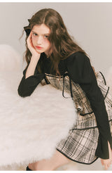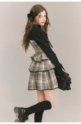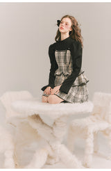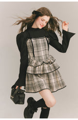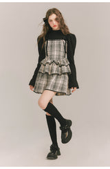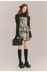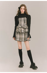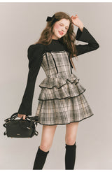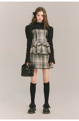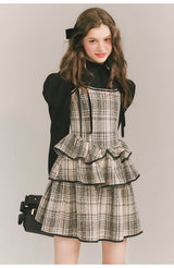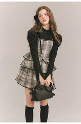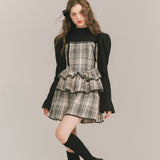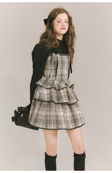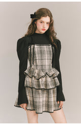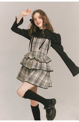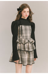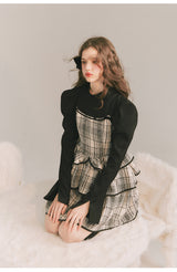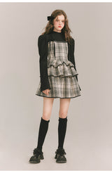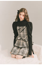 黒と白の縞模様がレトロな雰囲気を演出してくれるワンピース。ストラップワンピースとブラウスを一体化したようなアイテム。ワンピース部分は厚みのあるツイードとなっており、ウエストから裾にかけて、段となりボリュームのある膨らみがあります。優雅でロマンティックなお嬢様に。