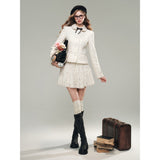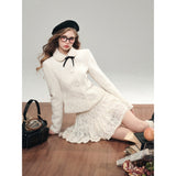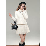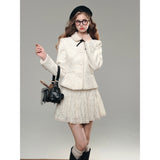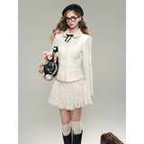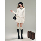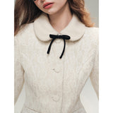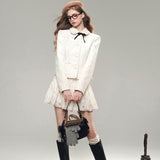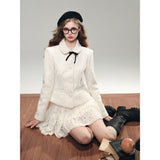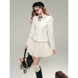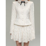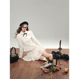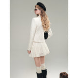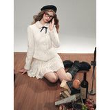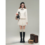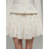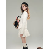 気品ある佇まいで凛とした美を表現した白薔薇のレースで仕立てたジャケットとショートスカート。美しい花々を彫刻で掘ったような立体感のあるテクスチャ。ジャケットは丸みのある襟と大きめのボタンが特徴で、女性らしさを強調しています。スカートはふわりと揺られると、軽やかで柔らかい印象を与えます。優雅で洗練された透明感あふれる女の子に。