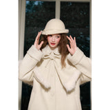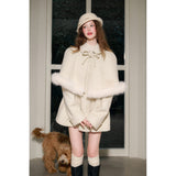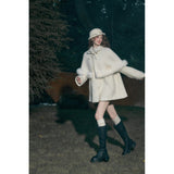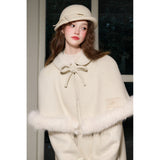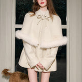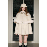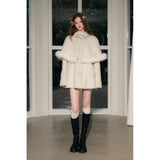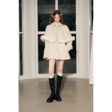 スクリーンに魔法をかけるエレガントな王妃みたいに演出してくれるケープコート。首元にはリボン、ケープの裾にはふわふわのファーが施されており、可愛らしさと上品さを兼ね備えています。全体としてヴィンテージ風の雰囲気を持ちつつ、現代的な洗練されたスタイルを表現したアイテム。