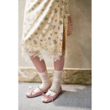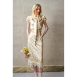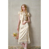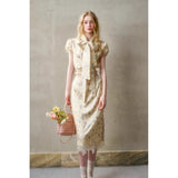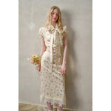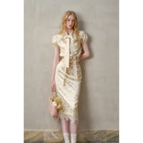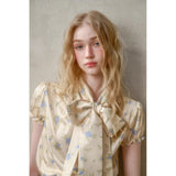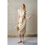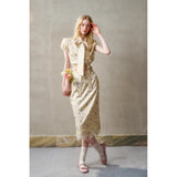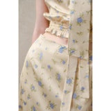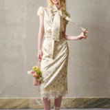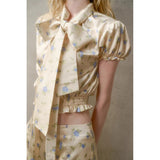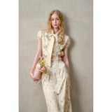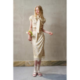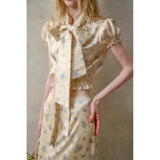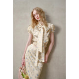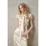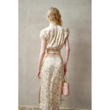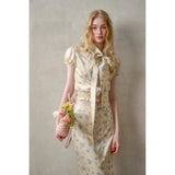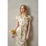 日常に溶け込む、心地よいエレガンス。淡いイエローのサテンのような艶感の生地に、ライトブルーの薔薇の花が散りばめられたブラウスとスカート。ブラウスは、パフスリーブとウエストのシャーリングディテールがガーリーでフェミニンな印象を与えます。存在感のあるリボンが胸元に華やかさを添えています。スカートは、ミディ丈で裾にレースがあしらわれ、柔らかくも品のある雰囲気に。サイドにスリットが入り、軽やかさと動きやすさも兼ね備えています。まるでフランス映画のヒロインみたい。