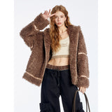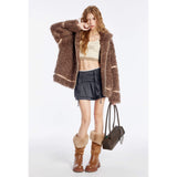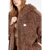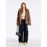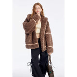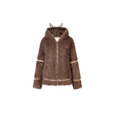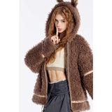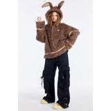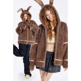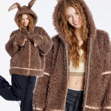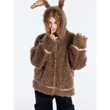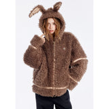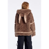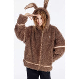 ふわふわ、もこもことしたフーディージャケット。フードには可愛らしいウサギの耳がついており、遊び心が感じられるデザインとなっています。オーバーサイズでリラックス感があり、カジュアルな印象を与えます。