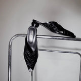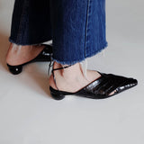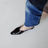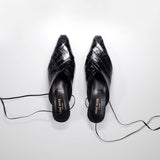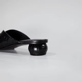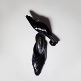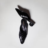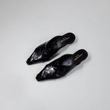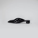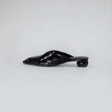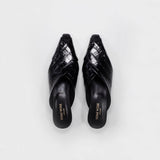 濡れたような漆黒色のスクエアトゥミュール。艶めく色合いが華麗な印象を与えてくれる。取り外し可能なストラップが付属しています。熟練の職人によって丁寧に縫製されたアイテム。日常でも使いやすく、デニムなどのカジュアルなボトムスにも合わせやすい。