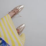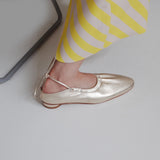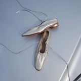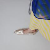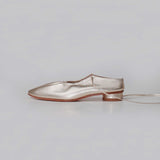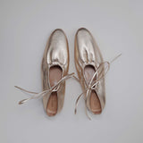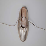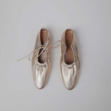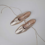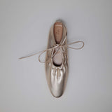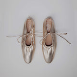 派手すぎず、エレガントな雰囲気の金色のラウンドトゥバレエシューズ。熟練の職人によって丁寧に縫製されたアイテム。靴紐は取り外し可能で、異なる結び方が可能です。日常でも使いやすく、明るい色合いのスカートや、カジュアルなデニムなどと合わせると素敵。