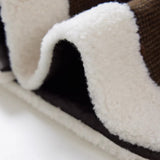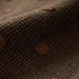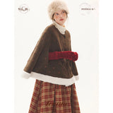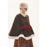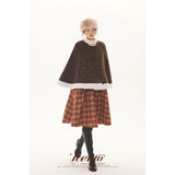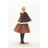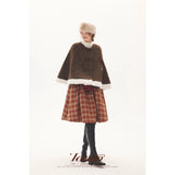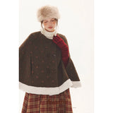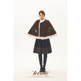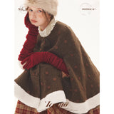 深みのあるブラウンを基調に、控えめなドットが織り込まれたケープコート。身体を包み込むように広がる柔らかなケープシルエットが印象的。裾部分にはふっくらとした白いボアがあしらわれることで、冬の空気をやさしく遮りながらもどこか童話的な雰囲気を醸し出しています。落ち着きと可憐さが同時に漂う一着。