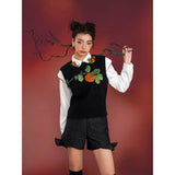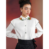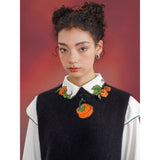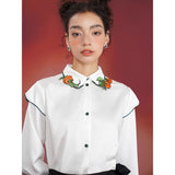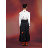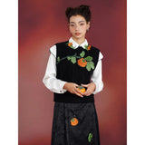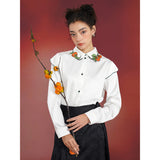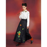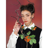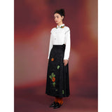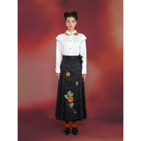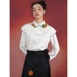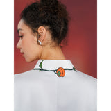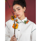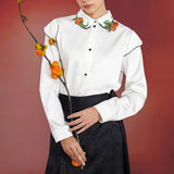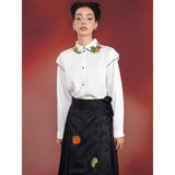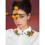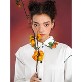 古くから人々に愛されてきた柿を襟部分に刺繍したブラウス。肩部分を張り出した独創的なデザイン。円満や調和を意味する柿。幸運や繁栄の象徴としての柿。和歌や短歌を通じて親しまれてきた柿を大胆に刺繍しています。美しさは時を超える。