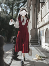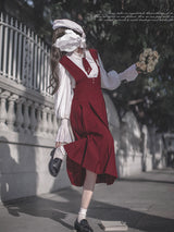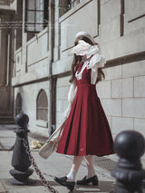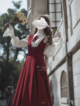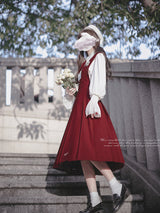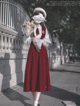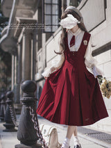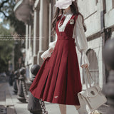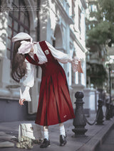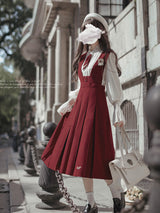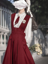 格調高き文学少女みたいに演出してくれる葡萄酒色のジャンパースカートとブラウス。ジャンパースカートはウエスト位置が高く、裾部分にはプリーツがかかり、刺繍が装飾されています。ブラウスは袖口が長く、レース刺繍が装飾されており、優雅な印象を与えてくれる。