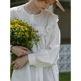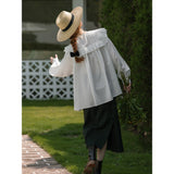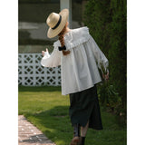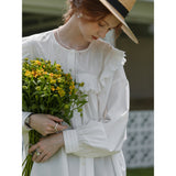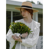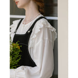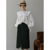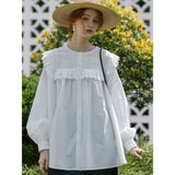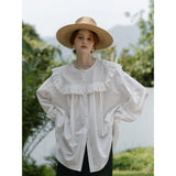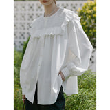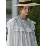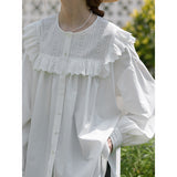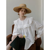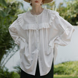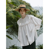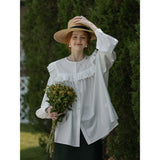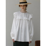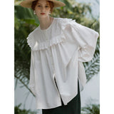 洗練されたクラシックなムードを演出してくれるブラウス。襟元と肩まわりの透かし彫りのデザインと、存在感のあるフリルが特徴的。ゆったりとしたオーバーサイズのシルエットはフェミニンでナチュラルな雰囲気を放っています。