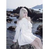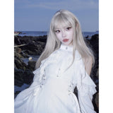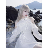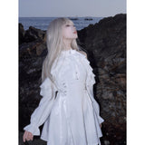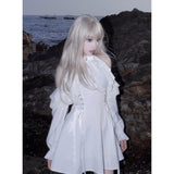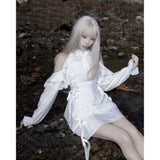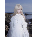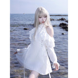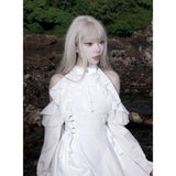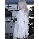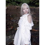 清純で純真な印象を与えてくれるオープンショルダーのワンピース。ハイネックなデザインと肩まわりにふんだんに装飾されたフリルとレースが華やかな雰囲気。ウエスト部分には編み上げが装飾されており、裾に向かってフレアに広がるシルエットが美しいスタイルに演出してくれる。