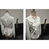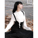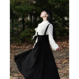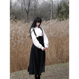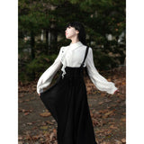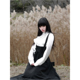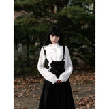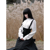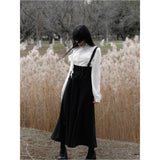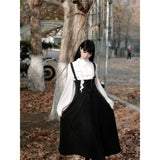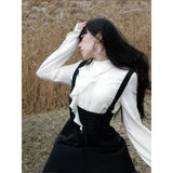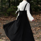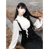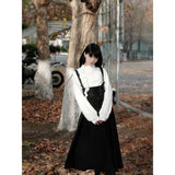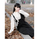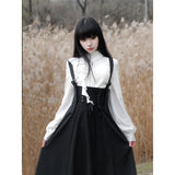 洗練された雰囲気を醸し出すジャンパースカートとブラウス。ジャンパースカートはウエスト部分に編み上げが施されたデザイン。フレアに広がるスカートが優雅な雰囲気を演出し、クラシックで洗練された印象を与えます。ブラウスは胸元のフリルが華やかさをプラスし、エレガントでロマンティックな雰囲気を醸し出しています。