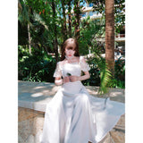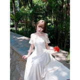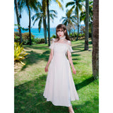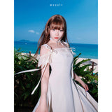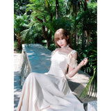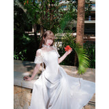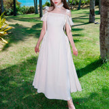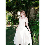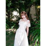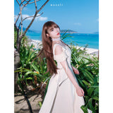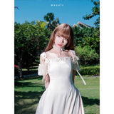 肩まわりを大胆に魅せたエレガントなストラップワンピース。肩にリボンで結ばれたストラップとレースのフリルが、クラシカルかつロマンティックな雰囲気に演出してくれる。バックには編み上げが施されており、美しいウエストラインが印象的。優雅な広がりのあるスカートシルエットに魅了される。