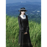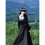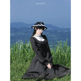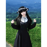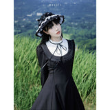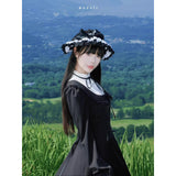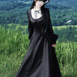 シンプルながらもクラシカルなディテールが際立つワンピース。ヴィクトリアンの香りを漂わせるデザインは、まるで物語の中から現れたような幻想的な存在感を放ちます。深い黒を基調にしながらも胸元に白の切り替えをあしらい、まるで夜空に浮かぶ月のように清廉なアクセントを添え、縁を彩る繊細なフリルと首元に結ばれたリボンは、少女の可憐さと淑女の気品を同時に引き出し、静謐な美を演出してくれる。