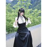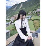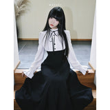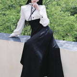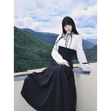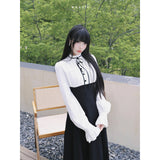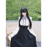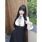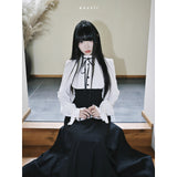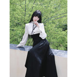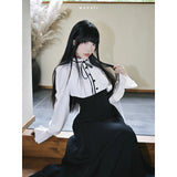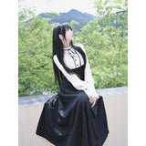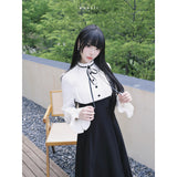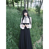 クラシカルなモノトーン配色が際立つエレガントなワンピース。上身頃は白のブラウス風で、フリル襟とリボンタイが清楚で品のある印象を与え、くるみボタンがクラシックな雰囲気を強めています。袖はややボリュームのある長袖で、カフス部分に向かってふんわり広がり、優雅なシルエットを描きます。ウエストから下は黒のロングスカートが流れるように広がり、モード感と格式を兼ね備えた存在感を放っています。上品でありながらどこか物語性を感じさせるデザイン。