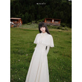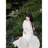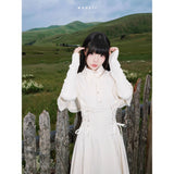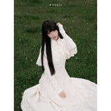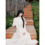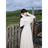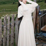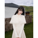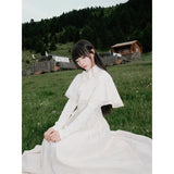 清楚で幻想的な存在感を放つケープワンピース。繊細なレースを縁取ったケープが肩を優しく覆い、リボンの結び目が少女らしい可憐さを添えています。サイドの編み上げデザインはシルエットに立体感を与え、流れるようなロング丈のスカートが風に揺られ、気品を漂わせています。まるで野に咲く一輪の白い花のように、素朴さと優美さを同時に宿すクラシカルなワンピース。