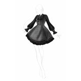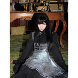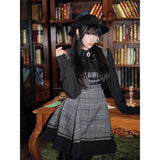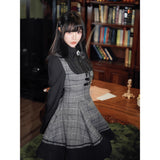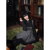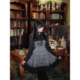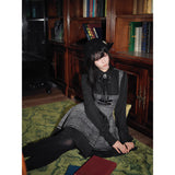 クラシカルでありながらどこか物語性を感じさせる、内省的で端正な美しさを宿したワンピース。グレートーンのチェック生地を基調に、胸元からウエストにかけてコルセットのように切り替えられた構築的なシルエットが印象的。黒の長袖ブラウスと一体化することで静かな緊張感と知性を纏わせ、スカート部分は程よいフレアと裾のプリーツが動くたびに揺れます。