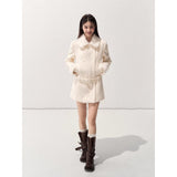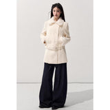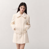 柔らかなアイボリーのウール地で仕立てられたコート。身体に沿うすっきりとしたシルエットで、襟元と袖口にあしらわれたふわりとしたファーが甘やかな雰囲気を醸し出しています。フロントは端正なダブルボタン仕様で、共布のベルトがウエストを静かに引き締め、ミニマルでありながらどこかクラシカルな気品を漂わせています。