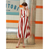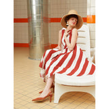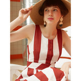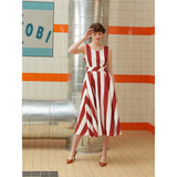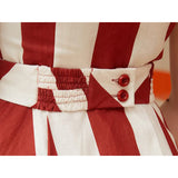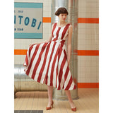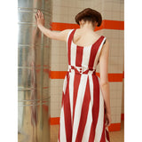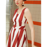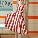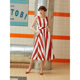 1960年代のレトロな雰囲気が漂うストライプ柄のノースリーブワンピース。ストライプ柄のウエストベルトを巻いたようなデザイン。往年の映画女優を彷彿とさせてくれる。フェミニンと品格を際立たせてくれる60年代ルック。