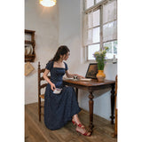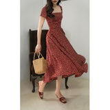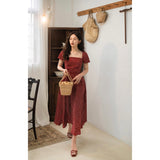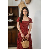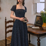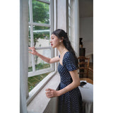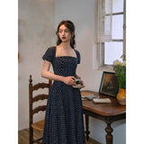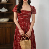1990年代の東洋の映画女優を彷彿とさせる水玉柄のワンピース。ウエスト位置が高く、軽やかに優雅に揺られるシルエット。首まわりを美しく魅せてくれすスクエアネック。お気に入りの首飾りを合わせてみて。
