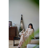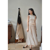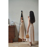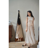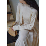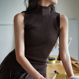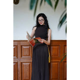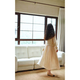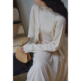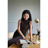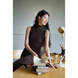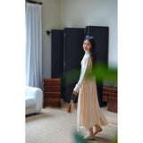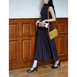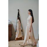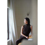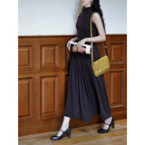 肩まわりを大胆に魅せたノースリーブのタートルネックニットとドレープスカート。歩くたびに優雅に揺られるシルエットが印象的。カーディガンを合わせたコーデも素敵。視線を誘う淑女スタイル。